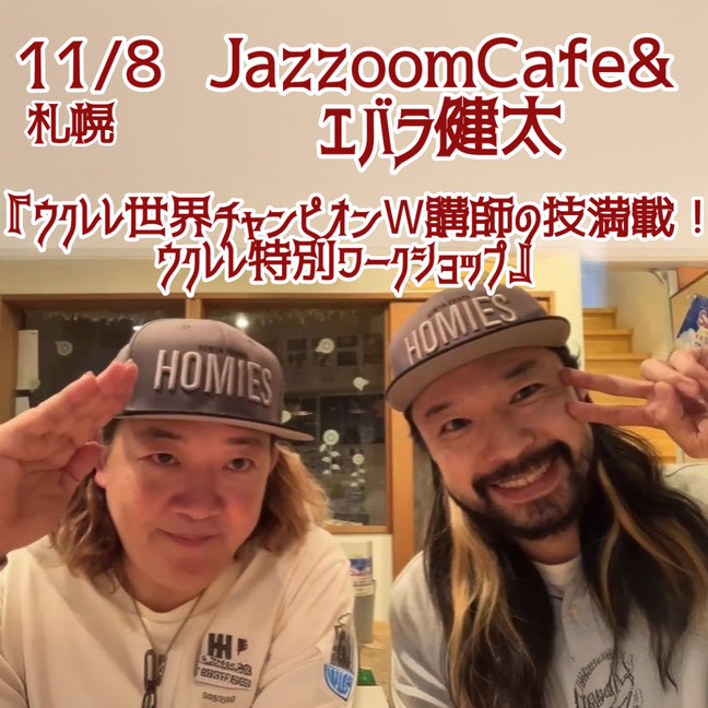 ウクレレ界のトッププレイヤー、JazzoomCafeとエバラ健太による夢の共演! 世界を舞台に活躍する2人のチャンピオンが、札幌に集結。 初心者から経験者まで、すべてのウクレレ愛好者に贈る、特別な一日。